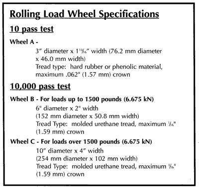 A restraining frame which laterally supports the mock-up assembly may be utilized to protect equipment or for personnel safety, provided said frame is constructed to not interfere with the panels or supporting understructure and provides clearance from any point of the mock-up prior to the start of test. Testing apparatus shall be designed to impose caster rolling loads directly on the mock-up system, with the load traversing in a fixed path on the three panels being tested. Dampening of mock-up, load, caster wheel applicator, load carriage or load bed is prohibited. |
