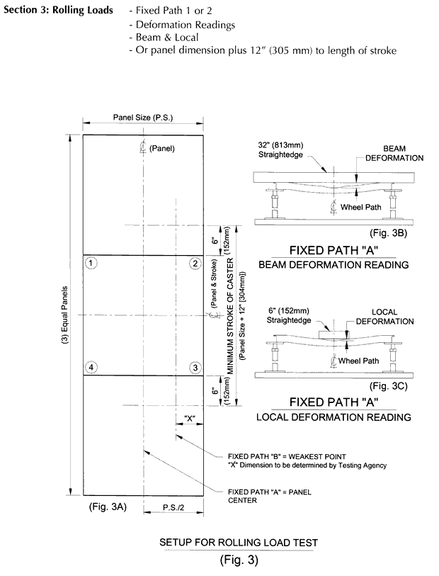 Path "1" Fixed path traversing across mock-up panels at panel centers. Path "2" Fixed path traversing across all three mock-up panels, along a line inboard and parallel from the outer edge as determined by the "weakest point." The "weakest point" is to be determined by the certifying independent testing agency and is defined as the path which yields the greatest top surface deformation under rolling loads as determined by this section. Wheel B and Wheel C shall be applied to separate mock-ups for each fixed paths 1 & 2 for 10,000 passes with deformation measurements at start and upon completion of 500, 5,000 and 10,000 passes. a. The center panel, prior to start of test, shall be measured for overall flatness utilizing a 32" (813 mm) long straightedge. The straightedge shall be placed parallel with each panel edge, flush with the edge or not more than 12" (12.7 mm) inboard from the edge. The straightedge shall also be placed along the diagonal in each direction. Measurement shall be taken at each straightedge location (6 locations) at the maximum variation and recorded and located for reference. (Note: If the panel configuration has an upward "crown", it shall be so measured and reported.) b. Prior to the start of test, the center panel, at points along the proposed caster path, shall be measures for local variation utilizing a 6" (152 mm) long straightedge. The largest six (6) variations shall be measured, recorded and located for reference.